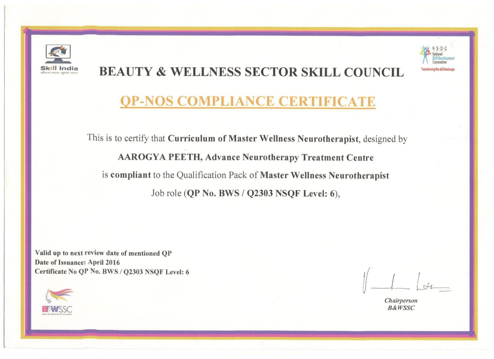 QP-NOS Compliance Certificate for Master Wellness Neurotherapist